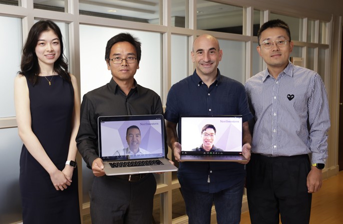 The study team from VUMC included, from left, Xinmeng Zhang, You Chen, PhD, Bradley Malin, PhD, and Chao Yan, PhD. On the computers are Northwestern Medicine colleagues Abel Kho, MD, and Yuyang Yang. (photo by Donn Jones)
